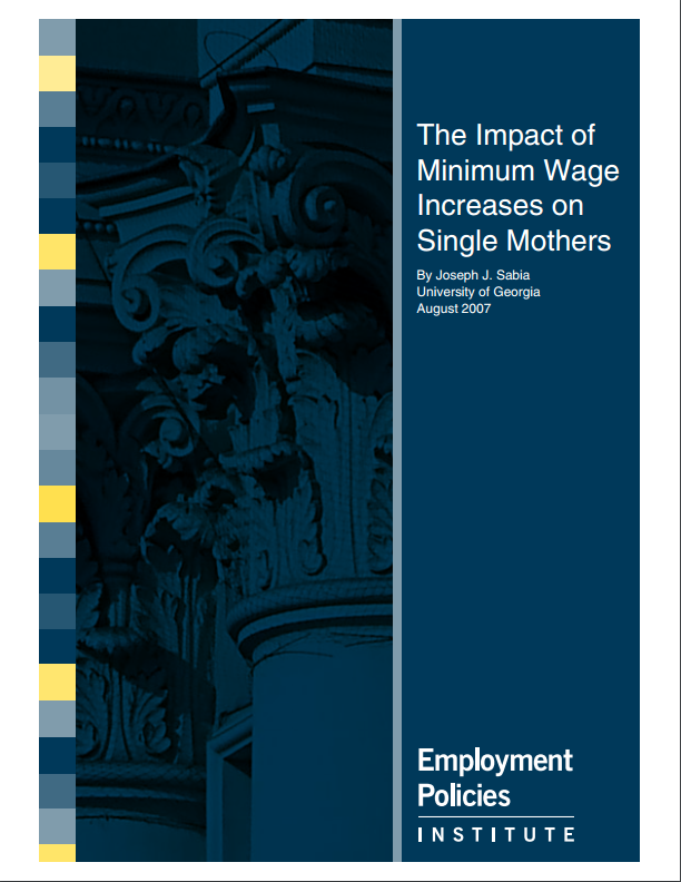 In this study, Dr. Joseph J. Sabia of the University of Georgia uses data from a pooled cross-section of unmarried mothers from the March 1990 to March 2005 Current Population Survey (CPS) to examine the effect of minimum wage increases on single mothers’ employment, hours worked, weeks worked, wages, wage income, welfare receipt, and poverty. As expected, the author finds that more highly educated single mothers—those with some post-high school education—are not affected by minimum wage increases because their skills command a wage premium higher than state or federal minimum wage levels. However, less-educated single mothers, who are more likely to earn lower wages than their higher-skilled counterparts, are adversely affected by mandated